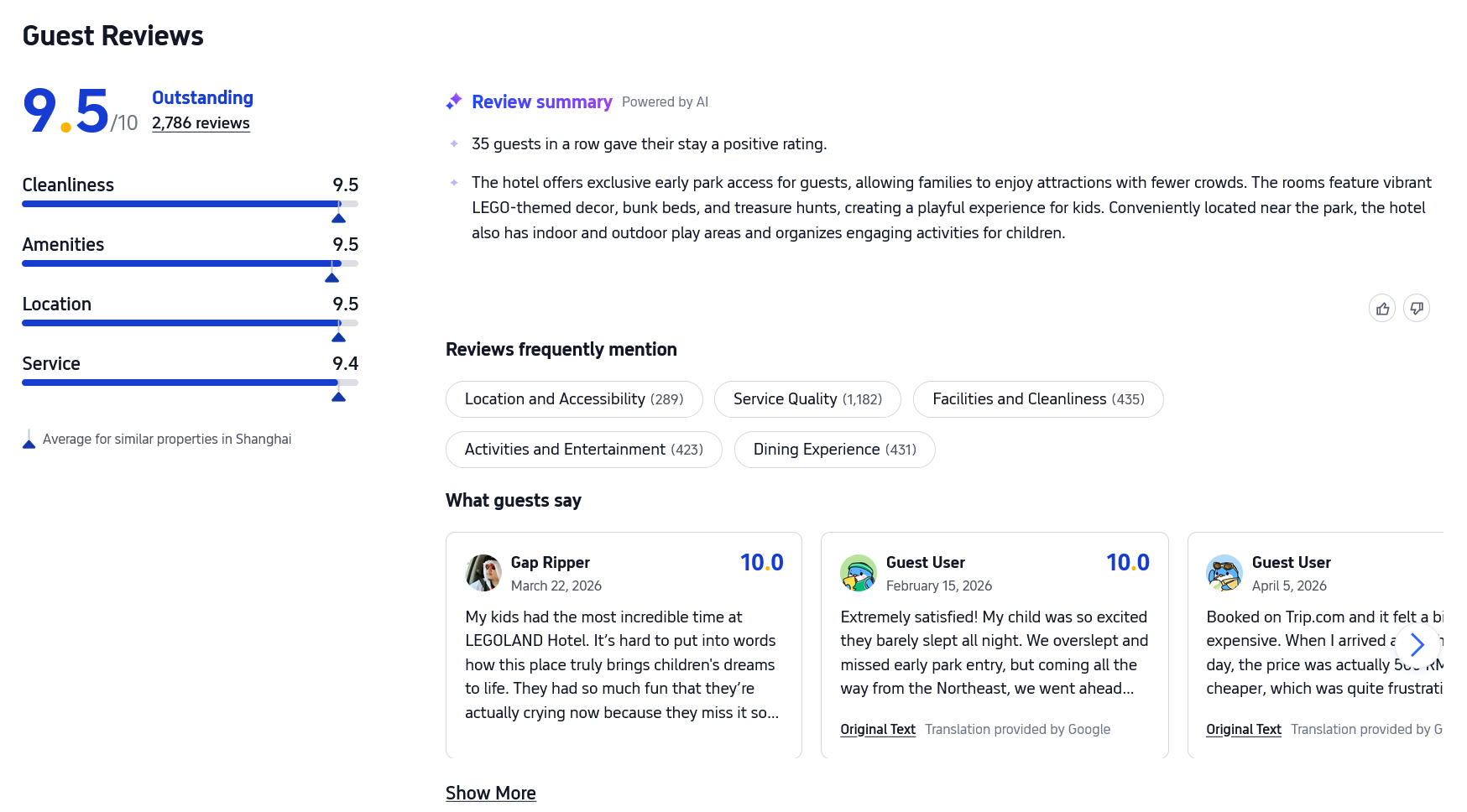 宾客们反复强调酒店的便利性:酒店距离上海乐高乐园度假区入口仅两分钟步行路程。如此优越的地理位置免去了通勤的烦恼,让家庭游客可以随时轻松返回房间休息或享用茶点。更令人惊喜的是,酒店客人可享受专属的提前入园特权,在正式入园前30分钟抢先体验热门项目。评论者们经常提到,这项特权让他们能够以最短的排队时间体验热门游乐设施,最大程度地享受游乐乐趣,最大程度地减少压力——对于带着幼儿出行的家庭来说尤其重要。.